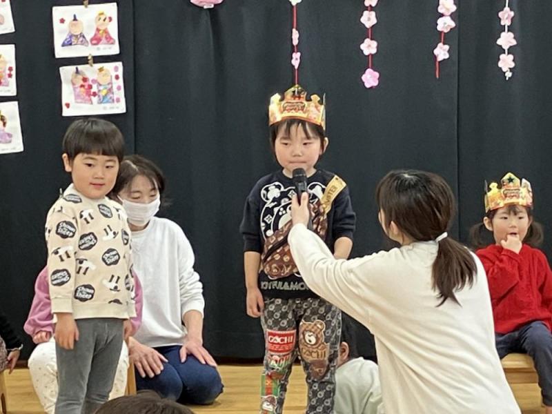 3月のお誕生日のお友だちをお祝いするひなまつり誕生会が行われました。誕生児のお友だちは恥ずかしそうにしながらも担任の先生と一緒にインタビューを受けたり得意なことを披露して、大きな拍手をもらいにんまり笑顔でした。お楽しみは、イラストを見ながらたくさんいるひな人形の一つひとつの名前や役割の話を聞いたり、ひなまつりに関する3択クイズを楽しみました。ひな人形についての話をしっかり聞いていた子どもたちはクイズも正解する姿が多く、大盛り上がりでした。おやつはひし餅風誕生ケーキで、大きないちごもケーキもおいしそうに平らげていた子どもたちです。