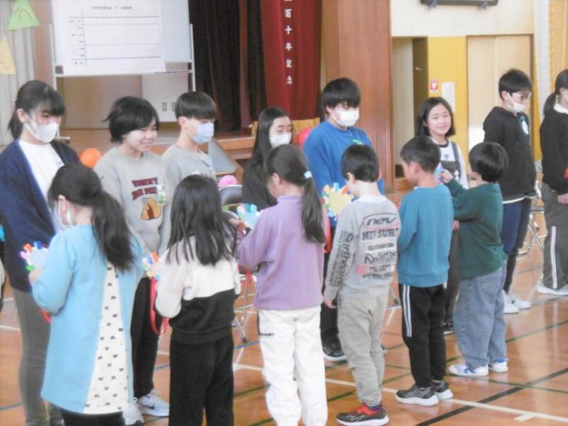 3時間目に「6年生を送る会」が行われました。致芳っ子たちの笑顔と真剣な顔が交差する素敵な時間となりました。1年生のエスコードで6年生が入場すると、まずは1年生が心を込めて作ったメダルの首飾りが贈られました。続いては、お待ちかねのゲームタイム。縦割り班ごとに協力して取り組み、笑顔あふれる時間となりました。うちわを使って風船を運んでリレーするゲームから始まり、お題に対する答えの言葉の文字数の多さを競うゲーム、フラフープを班ごとに手をつないだまま全員がくぐる速さを競うゲームと続きました。5年生の皆さんの進行ぶりも上手でした。楽しいゲームの後は、6年生に色紙のプレゼント。そして、「Believe」の歌声を届けました。ピアノ伴奏も5年生、上手でした。すばらしい! 歌っている表情は、みんな真剣で、思いが伝わってきます。そして、6年生からは、各学年との思い出や期待の言葉が贈られました。凛とした態度は、さすが6年生です。閉会の前には、「ちょっと待った!」の声と共に5年生が登場し、6年生に感謝を伝えるエールが贈られました。すると、6年生からも「ちょっと待った!」と、6月の運動会を彷彿させるお返しのエールが。最後の最後まで、素敵な時間となりました。18日の卒業式もきっといい時間になることでしょう。