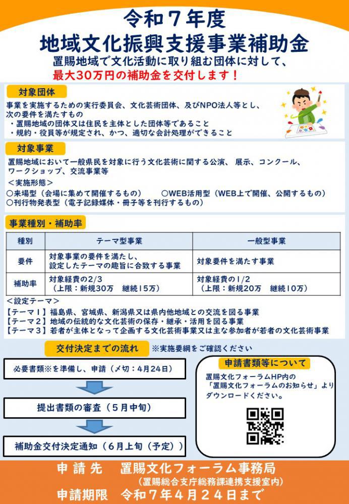 置賜文化フォーラムでは、置賜地域の皆さまが企画・運営する文化芸術事業を支援する「地域文化振興支援事業」を実施しています。このたび、令和7年度事業の募集を行いますのでお知らせします。■実施形態@来場型:来場者を会場に集めて開催するものAWEB活用型:WEB上で開催・公開するものB刊行物発表型:公開や作品等を収録した電子記録媒体・冊子等を刊行するもの■支援内容@置賜地域の文化ホールで演劇の公演をしたい!Aオンラインで置賜の伝統文化を学ぶワークショップをしたい!B会員による置賜の風景写真の作品集を発行したい! などといった事業に対し、置賜文化フォーラムが補助金を交付します。■申請期間令和7年3月24日(月)〜4月24日(木)・実施要綱の内容をご確認のうえ、申請書を作成し、置賜文化フォーラム事務局に提出してください。■実施要綱等・実施要綱・申請書等様式・チラシ■お問合せ・申請先置賜文化フォーラム事務局(置賜総合支庁総務課連携支援室)住所:〒992-0012 米沢市金池7丁目1番50号電話:0238-26-6021 FAX:0238-26-6022