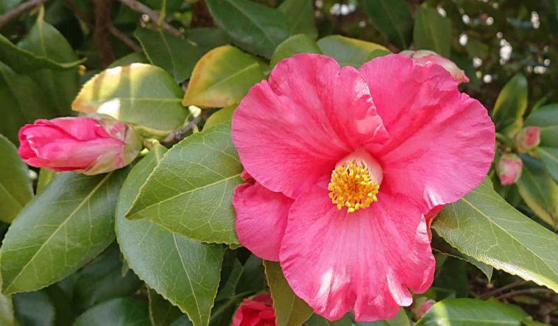 ●春の訪れ ツバキの花 ようやく昨日から暖かくなり下校の児童が半そで短パンで歩いていました 若いって羨ましい 散歩でツバキの花がさいているのを見つけました 暖かさに誘われて咲いたのでしょうか 日増しに春の装いが鮮やかになってきましたした