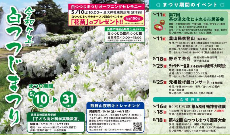 白つつじまつりまつり期間/令和7年5月10日(土)〜5月31日(土) 白つつじまつりオープニングセレモニー5月10日(土) 午前10時〜 皇大神社東側広場(古木前) 白つつじまつりオープン記念イベント 「花苗」のプレゼント(先着150名) (※定数になり次第終了します)-----------------------------------------------長井の特産品販売(土産品限定)白つつじ公園内つつじ館 営業時間 10:00〜15:00※開花状況に合わせた営業となります---------------------------------------------- まつり期間のイベント案内5月10日(土)長井高校探究科学部「子ども向け科学実験教室」園内遊具広場にて/ 10:00〜 (材料がなくなり次第終了)※参加無料 【5/17も開催】 5月11日(日)第7回 茶の湯文化にふれる市民茶会午前10時30分〜午後3時 会場/白つつじ公園内・主催/(一社)表千家同門会山形県支部 ・主管/(一社)表千家同門会山形県支部 長井地区 ・後援/長井市 ・問い合わせ/TEL0238-84-4374(菊池) 5月11日(日)葉山民衆登山 (雨天中止)受付/午前6時30分 はぎ苑駐車場集合 (受付は当日集合になります) (登り:勧進代コース/下り:白兎コース)参加料/1,500円(保険料・入浴料・記念写真など)問い合わせ/TEL0238-84-0015(長井山岳会 鈴木) 5月17日(土)長井高校探究科学部「子ども向け科学実験教室」園内遊具広場にて/ 10:00〜 (材料がなくなり次第終了)※参加無料 5月18日(日)野だて茶会 午前10時〜午後15時 (園内) 表千家清友会 5月24日(土)第35回 ながい黒獅子まつり 5月25日(日) チャリティー盆栽(さつき・松柏・雑木) 山野草 大即売会 午前8時〜午後5時 会場/白つつじ公園グラウンド北側問い合わせ/0238-84−1616(長井樹石会・小関) 5月25日(日)元祖投げ銭コンサート 午後1時〜4時 場所/白つつじ公園内 (小雨決行)出演/影法師問い合わせ/0238-84−0360(横澤) 協賛行事 5月16日(金)〜18日(日)白つつじまつり協賛 第48回暢神書道展 午前10時〜午後6時(最終日は午後5時まで) 会場/長井市民文化会館 3階大会議室 入場無料 5月18日(日)第42回 白つつじまつり囲碁大会 受付/午前9時30分 開始/午前10時会場/置賜生涯学習プラザ 会費/2,200円(昼食代込)問い合わせ/рO90−4557−8559(梅津) ---------------------------------------------------- やまがたアルカディア観光局 熊野山夜明けトレッキング開催期間 5/16(金)〜6/1(日)やまがた百名山の一つに選定されている「熊野山」。そこから望む、絶景の散居集落の夜明けの風景。絶景の夜明けの風景を堪能しませんか??豪華参加者特典をプレゼント!詳しくはコチラ 問い合わせ先/TEL0238-88-1831(やまがたアルカディア観光局)----------------------------------------------------------- 開催内容が変更になる場合がございますので、長井市観光ポータルサイト(ホームページ)でご確認ください。 お問い合わせ先 長井市観光協会 0238−88−5279 長井市観光文化交流課 0238−82−8017