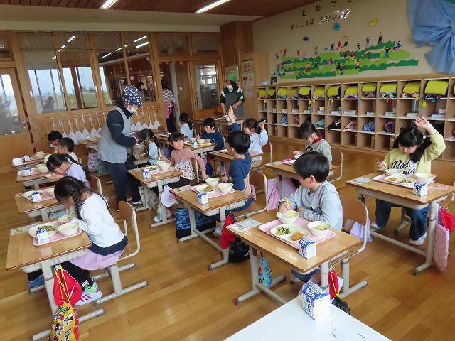 1年生の給食が今日からスタートしました。準備の仕方をしっかりと学び、てきぱきと準備を進めることができました。とても立派でした。準備完了! いただきます!