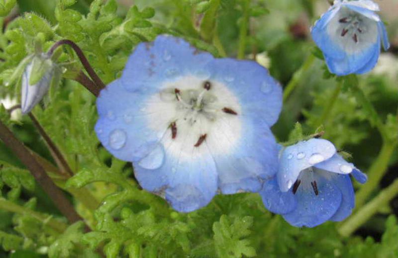 ●「ネモフィラ」の苗を一株購入し他の草花と一緒に寄せ植えをしました 冷たい雨に打たれながら花を咲かせています 以前見てきたひたなか海浜公園の見事な「ネモフィラ」が今も印象に残っています 広大な丘陵に咲く「ネモフィラ」と青い空が一体となり天空の丘のような風景が広がっていました