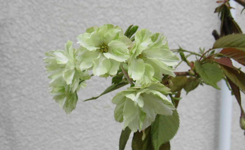 ●緑色の桜「御衣黄」が咲きました 何年か前にもらった御衣黄の桜はソメイヨシノから少し遅れて開花しますが今年は例年よりは早めの開花となりました 江戸時代からあった桜で「御衣黄」という名前は貴族の衣服の萌黄色に近いところかっら命名されたと言われています 花の色は黄緑色から徐々に白くなり やがて花びら全体がピンクへと次第に変わっていき 一本の木で緑 白 ピンクの共演が楽しめるとても変わった桜です