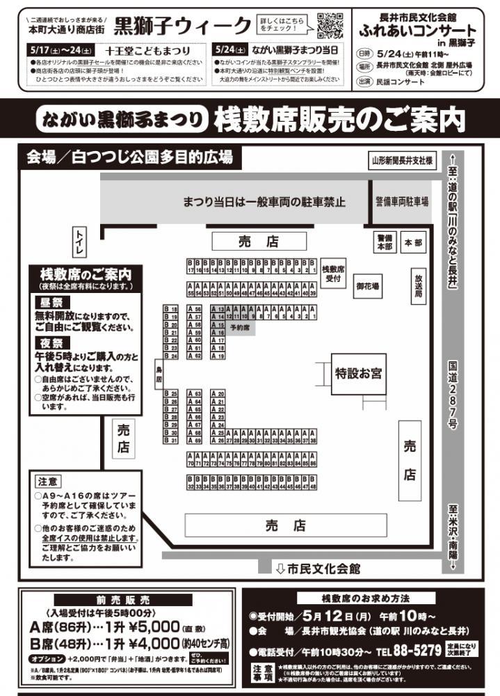 第35回 ながい黒獅子まつり(令和7年5月24日(土)開催) 【桟敷席(有料席)】について夜祭 全席有料(昼祭は無料開放)<夜祭の入場受付は午後5時00分〜> 《桟敷席販売のお知らせ》前売り販売 A席(86升)…5,000円(直敷)B席(48升)…4,000円(約40センチ高) ※A.B席どちらも 1升『2名』定員※幼児・小学校低学年までのお子様は、1升内1名のみ同席可(90a×180a コンパネ) 他のお客様のご迷惑のため全席イスの使用は禁止します。ご理解とご協力をお願いいたします。(直敷)への着座が困難な方は高さのある「B席」をご購入ください オプション! プラス2,000円で「弁当」+「地酒」がつきます。ぜひ、ご予約ください! 《桟敷席のお求め方法》受付開始/5月12日(月) 午前10時〜会場/長井市観光協会(道の駅 川のみなと長井にて)電話受付/5月12日(月)午前10時30分〜 TEL0238−88−5279 ※定員になり次第終了≪注意事項≫(必読)・桟敷席ご購入以外の方のご利用は、他のお客様にご迷惑がかかりますので、ご遠慮ください。(※桟敷席券のない方のご着席は固くお断りしています)・桟敷席全席イスの使用は禁止いたします。(直敷)への着座が困難な方は(約40センチ高の)『B席』をご購入ください・不適切行為があった場合は、退席をいただく場合がございます。・ツアー予約席として一部確保していますので、ご了承ください。(A9〜A16)・自由席はございませんので、あらかじめご了承ください。【空席があれば、当日販売も行います】———————————————《関連企画》【黒獅子ウィーク】5/17(土)〜5/24(土)本町大通り商店街・黒獅子セールや獅子頭の展示のほか、黒獅子まつり当日は「スタンプラリー」開催!また「特別観覧ベンチ」が設置されます!【ふれあいコンサートin黒獅子】長井市民文化会館5/24(土)午前11時〜長井市民文化会館 北側 屋外広場(雨天時ロビーにて)民謡コンサート——————————————— 開催内容が変更になる場合がございますので、長井市観光ポータルサイト(ホームページ)またはSNSにてご確認ください☆.。.:*・°☆.。.:*・°☆.。.:*・°☆☆.。.:*・°☆.。.:*・°☆.。.:*・°☆【長井市観光協会 公式SNS】長井市観光協会のFacebook・Instagramでは、黒獅子の情報をはじめ、開花状況やイベント情報を発信中!ぜひフォローお願いしますFacebookInstagram☆.。.:*・°☆.。.:*・°☆.。.:*・°☆☆.。.:*・°☆.。.:*・°☆.。.:*・°☆