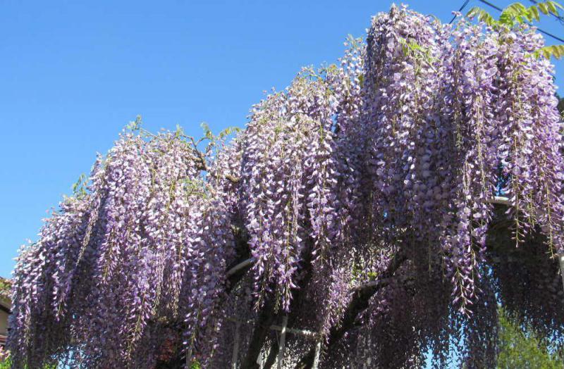 ●「フジ」の花が満開 鉢植えでもらったフジを地植えして40年以上は過ぎたフジの花が庭を彩っています 庭には様々な花が咲いており花の周りにはクマンバチが飛び回っています 心なしかフジの紫色が少し色あせているような気がしますが花を楽しんでいます 満開です花見にいらしてください 見せるほどではありませんが