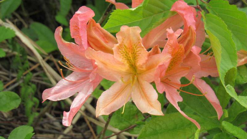 ●なんと優雅なツツジの花 山際の堤の土手にオレンジ色の花がたくさん咲いていました 花全体が豪華でアザレアにしては咲くのが早く「レンゲツツジ」と教えていただきました 6月前後に咲くのでは夏の花と言えば「レンゲツツジ」だそうです 五つの星形の花を咲かせ一度咲くと数日間咲きっぱなしで陽ざしの中でも眩しい光を放ってきれいな姿を見せています サツキはこの後に咲きはじめます