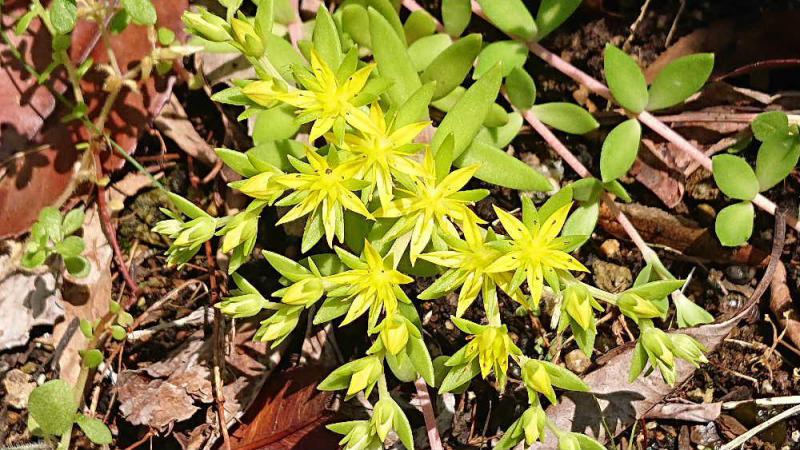 ●とある家の庭に「ツルマンネングサ」が一面に広がっていました 黄緑色の葉の中に黄色の小さな花が咲いていました 繁殖力が旺盛で地面を這うように次々と増えていくそうです この家の庭にもびっしりと生えていました 成長が早くちぎれた葉1枚が地面に残っているとそこから発芽してしまうそうです 比較的短期間で地面を這うように広がるのでグランドカバー植物として利用されることもあるそうです