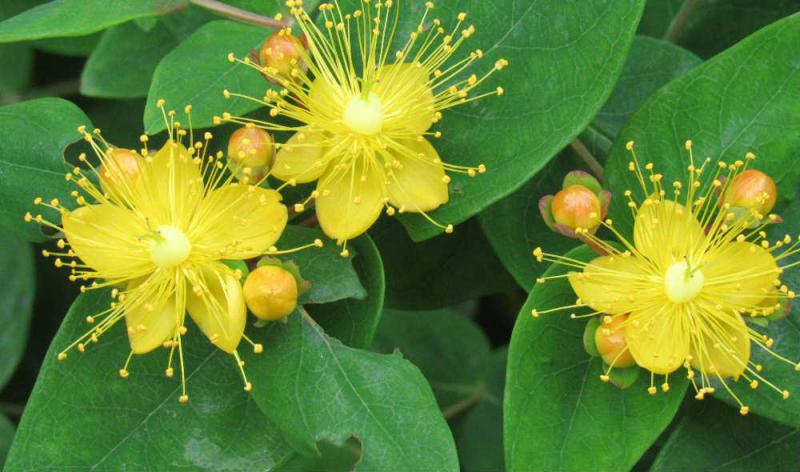 ●鮮やかな黄色の花びらが5枚と細い金糸ののような雄しべをびっしりと付けた可愛い花がさきました 花が終ると小さなさくらんぼに似た赤い実をつける可愛い花木です 緑の葉 黄色の花 赤い実の3色が楽しめる庭を賑やかに演出してくれる「ヒペリカム」でしょうか あまり病気もせずあまり大きくもならず丈夫で育てやすい花木です