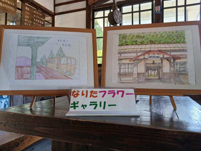 羽前成田駅の待合室に、新たな作品が展示されています。一枚はフラワー号がホームに入って来る場面。もう一枚は成田駅の正面を描いたもので、細部の描写と丁寧な色使いがとても素敵な作品です。 今回は、山形鉄道さんから「なりたフラワーギャラリー」のプレートを準備していただきました。待合室が私たちと山形鉄道をつなぐ場所になればいいですね。 初めての展示の様子はこちらから → 待合室のミニギャラリー:おらだの会