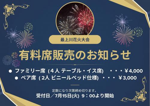 令和7年8月2日(土)開催第30回 最上川花火大会の有料席の販売のお知らせ ファミリー席(4人/テーブル・イス) ¥4,000ペア席(2人/ビニールベット仕様) ¥3,000 受付開始日:7月15日(火)〜(席が埋まり次第受付終了)平日9:00〜17:00まで(ご予約は平日のみしかお受けできません、ご注意ください) お問い合わせ先:長井市観光協会 TEL/0238-88-5279 席図については後日お知らせいたします。(例年ですとファミリー30、ペア10になります) ☆.。.:*・°☆.。.:*・°☆.。.:*・°☆☆.。.:*・°☆.。.:*・°☆.。.:*・°☆ 席の空き状況に関しましては随時SNS(ストーリー)で更新いたしますので、お電話の際には是非ご確認ください。【長井市観光協会 公式アカウント】FacebookInstagram ☆.。.:*・°☆.。.:*・°☆.。.:*・°☆☆.。.:*・°☆.。.:*・°☆.。.:*・°☆