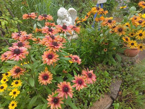 昨日の夜から、期待していた恵みの雨!庭に水分補給してくれましたが、今日は山形県で今年初めての熱中症警戒アラートが発表され、梅雨明けも金曜日頃…? 我が庭もすっかりご無沙汰でしたが・・・ (トップ写真)。。。いつの間にか我庭に増え続ける『ルドベキア』じーじがせっせと集めています!日持ちが良くて、まだまだ咲いてくれそうですね。 前年購入品でルドベキア”キャラメルミックス”(6/30UP)ルドベキア”チムチムニー”(6/26UP)左下に咲いているのは今年の新人花、背の低い”トトレモン" 6/26ブログより”ルドベキア チムチムニー”チムチムニー、面白い名前ですね(^^) 6/30ブログよりルドベキアアーバンサファリ ”キャラメルミックス”今年は早く咲きました。ちょっと変わったとても素敵な色合いです。 ヒューケラの花壇脇には、ルドベキアアーバンサファリ ”フォレストグリーン”レモンイエローの色合いが好きです。 今年2年目、ようやく庭の土に馴染んできた花です。“シルフィウムモーリー” "エキナセア"今まで何種類か植栽したのですが、残っているのはこの花だけです…イエローの庭の中で、長い期間咲いてくれています! 毎年登場している、おなじみの”ヘメロカリス”いくつもの種類があったのですが、今はこれだけになってしまいました。 ユーパトリウム “ベビージョー”和名では"フジバカマ"と呼ばれています。開花時期の早い花です。 "カシワバアジサイ"もいい感じに。ドライで楽しめます〜! いつの間にか、こんなに開花していました。花数も多くいちばん早いユリです。 おまけに・・・ばーばの花遊び〜今までのビオラと交代の“ピレア グラウカ”先日、ポピーさんから購入、暑い夏も乗り越えられそうですが、水切れに注意、挿し木で増やせそうです。 多肉の“子宝草”すごい子供の数ですー! 沢山の写真が残ってしまいましたが、少しでもたくさんUPしたくて長くなってしまいました。毎年、、同じようなネタ花ですが・・・