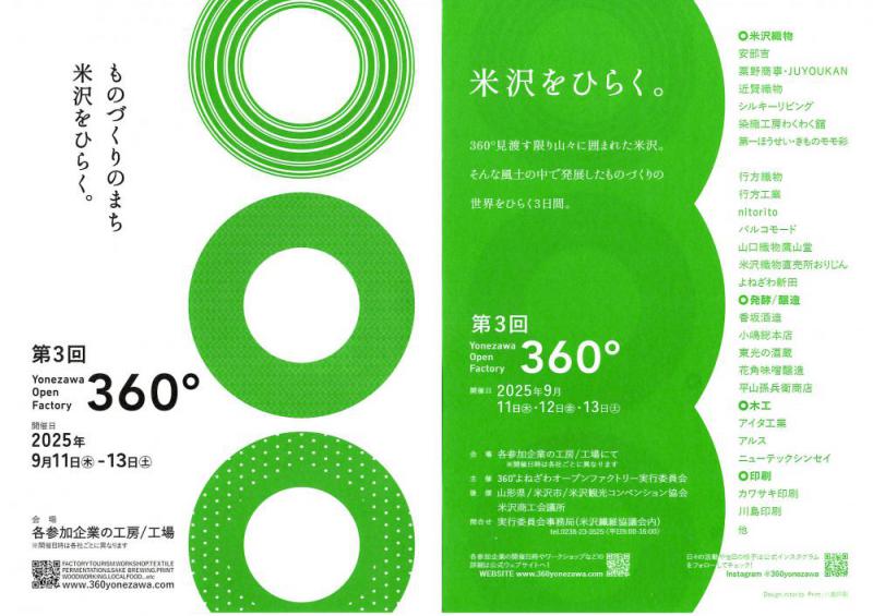 360°見渡す限り美しい山々に囲まれた米沢。そんな風土の美しさとともに、米沢のものづくりの世界観をぐるっと見渡し、実際に触れていただきたい。そんな想いから、皆さまを工房へとお招きし、さまざまな企画を開催します。米沢の伝統に触れられる3日間、ぜひお楽しみください。 ◇開催日 2025年9月11日(木)〜13日(土)◇会 場 各参加企業の工房/工場にて※開催日時は各社ごとに異なります。●米沢織物 安部吉/粟野商事・JUYOUKAN/近賢織物/シルキーリビング 染織工房わくわく館/第一ほうせい・きものモモ彩/行方織物 行方工業/nitorito/パルコモード/山口織物鷹山堂 米沢織物直売所おりじん/よねざわ新田●発酵・醸造 香坂酒造/小嶋総本店/東光の酒蔵/花角味噌醸造/平山孫兵衛商店●木 工 アイタ工業/アルス/ニューテックシンセイ●印 刷 カワサキ印刷/川島印刷※各参加企業の開催日時やワークショップなどの詳細は公式ウェブサイトへ www.360yonezawa.com 【主催】360°よねざわオープンファクトリー実行委員会【お問い合わせ】 実行委員会事務局(米沢繊維協議会内) TEL:0238-23-3525(平日9:00〜16:00)