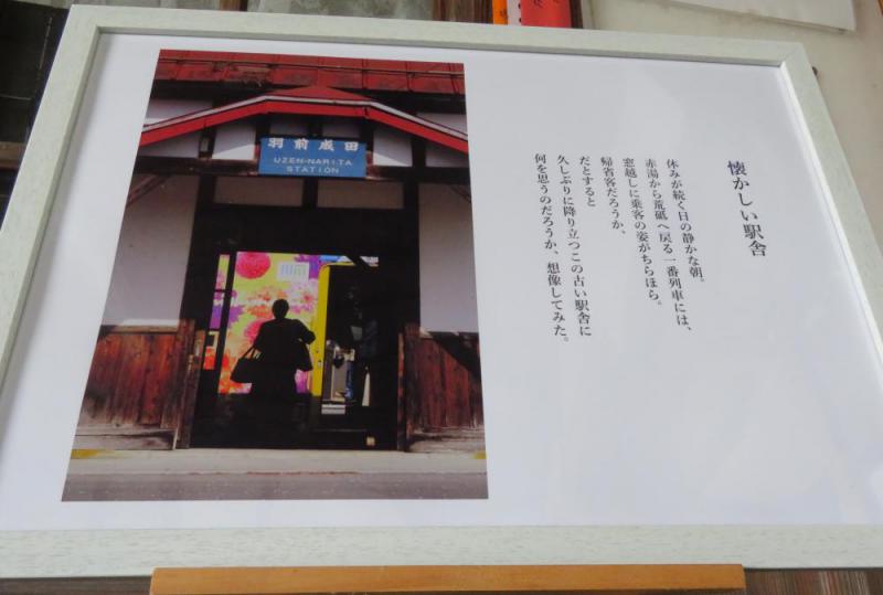 蛭川さんの『時季を刻む鉄道景』展の作品を紹介します。最初に紹介するのは「懐かしい駅舎」と題する作品。(一部を省略しています)   休みが続く日の静かな朝  窓越しに乗客の姿がちらほら  帰省客だろうか だとすると  久しぶりに降り立つこの古い駅舎に  何を思うのだろうか  もうすぐ田舎の旧盆である。駅ノートにも「○年ぶりで帰省した」との記入もみられる。帰省客がこの駅に降り立った時、どんな思いが巡るのであろうか。この作品を見て改めて思った。