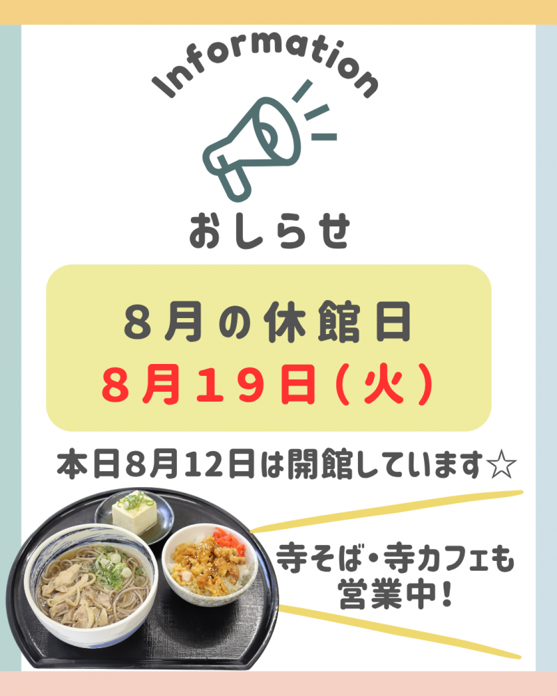 8月の休館日は通常の第二火曜日ではなく8月19日(火)となります。8月12日?は開館しておりますので、皆様のご来館をお待ちしております。