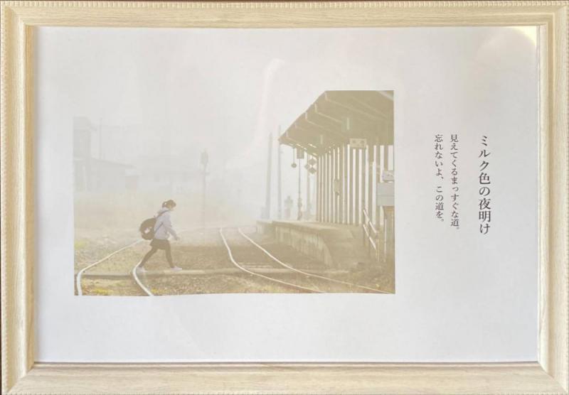 ミルク色の夜明け  見えてくるまっすぐな道。  忘れないよ、この道を。  作者の蛭川さんに、今回展示された作品の中で一番思い入れのある作品はどれですか、という大変失礼な質問をしたところ、蛭川さんはこの「ミルク色の夜明け」だと教えてくれました。「今回の展示が決まった段階で、出品作品として最初に浮かんだのがこの作品です。」と。「納得する乳白色を出すために何回もプリントし直しました。」とも。 「ミルク色の夜明け」には、題名を含めてたった3行の文しか添えられていない。そのことを尋ねると、「これは『フランダースの犬』というアニメの主題歌の一節です。大好きだった物語とその主題歌をイメージした作品を撮りたかったのです。」とのこと。  通学列車に向かう女生徒は、今はどうしているのだろう。希望へと続く道は見えているのだろうか。通い続けたこの道を忘れないでいてほしいものだ。蛭川さんにお話を伺った後に、そんな思いがよぎった。
