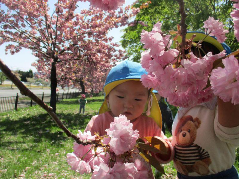 桜が満開の春、大好きな園庭遊びや散歩を楽しみました。木の根っこに何か気になるものを見つけて観察していると、「なに?」「どうしたの?」と興味を持ったお友だちが次々に集まってきます。お店屋さんごっこではお友だちとのやりとりが楽しそうです。雨どいを利用してのサーキット「すごいね」と言われると得意そうな表情をして車を走らせていました。