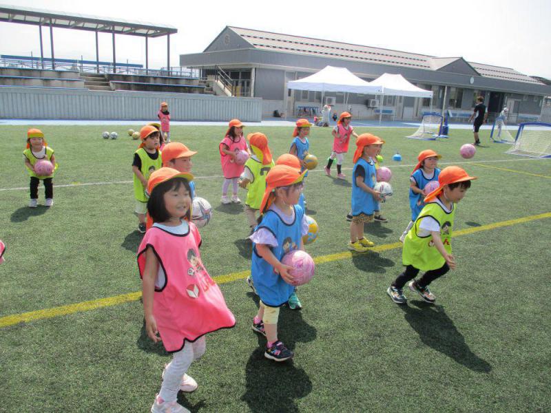 米沢市営人工芝サッカーフィールドを借りて、年中、年長児を対象にキッズ巡回指導に来ていただきました。年中組さんは初めてということで、何日も前からワクワクしながら楽しみにしていました。年長組は遊びの中でもサッカーを楽しんでいることもあり、朝から張り切っていました。フィールドでは一人一人ボールに触れることが嬉しくて、ミニゴールに向かって元気いっぱいシュートしていました。