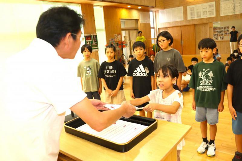 本日の全校朝会は、2学期学級委員任命と、代表児童による「2学期がんばること」の発表でした。すでに男女1名ずつとは決めていないため、各学年男子のみ、女子のみの学級委員がおります。みんなすばらしい態度でした。任命証を渡したときに一人一人が決意の言葉をそれぞれに述べてくれたのが印象的でした。「2学期がんばること」の発表では、4年生の代表児童が発表しました。堂々と発表する姿、こちらもすばらしかったです。