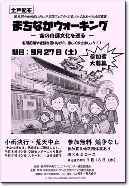 ※この事業は終了しました。ご参加、ご協力ありがとうございました。 第8回中央地区いきいき交流フェスタ「まちなかウォーキング」を開催します。今年のテーマは「宮の舟運文化を巡る」。宮の舟運に関係する史跡や老舗の建物などを見ながら歩くウォーキングです。 気軽なお散歩「小桜街区コース(約4km 60分程度)」とじっくり歩ける「神様仏様コース(約6km 90分程度)」の2コースを準備しています。長井市内に居住の方、もしくは長井市出身の方ならどなたでもご参加いただけます。ご近所の方やお友だちとチームを作ってぜひご参加ください。 長井市中央地区のみなさまには本日全戸へのチラシ配布をお願いしていますので、詳しくはそちらをご覧いただければ幸いです。中央地区で地区単位での参加の場合は、参加人数に応じて団体賞も準備しています。 クイズに答えたり、スタンプを集めながら歩く楽しいウォーキングです。速さを競うものではありませんのでどうぞお気軽に! 期日:令和7年9月27日(土)集合:8時30分 交流センターふらり(屋城町6-53)対象:長井市居住の方、または長井市出身者を含むグループ参加無料! 競争無し! 詳しくはこちらから(PDF) お申し込みはこちらから Instagramはこちら
