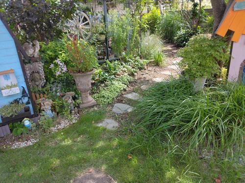 昨日から今朝にかけて本格的な雨が・・・ようやくおさまってきたので花ネタを探しにグル〜と。 すっかりお休みしていたので、撮っていた写真もどうまとめていいか悩んでしまいました。 今は、老犬サスケの世話で頭はいっぱい…ブログの感覚も薄れて来ました。 さて、今日の写真は、昨日の青空と今日の雨上がりの庭です。 ↓昨日の朝、青空とコラボの”はぎ”9月初めから咲き始めたのですが、まだこんな感じです。 ↓ヘリオプシス“ブリーディングハーツ” もう倒れた状態ですが、太陽に向かって咲いてくれる元気な花です。 オレンジの色合いが気に入っています♪ ↓その手前には、アジュガを植栽しているのですが暑さにも負けず、満杯状態!半日陰のおかげ。 ↓グラス“スキザクリウムプレーリーブルース” ちょっと疲れ気味の姿に… 秋の庭には“カリメリス七変化”そして放任のままの“エリゲロン”があるのですが撮り漏れでした… いつもの風景ですが・・・この小道の両側は白色フジバカマに統一する予定でいます。 ばーばの仕事は・・・ ↓暑くてなかなか庭仕事もできませんでしたがミニガーデンの散髪してみました。 ↓寄せ植えも元気なものだけで植え直してまとめてみました。何とか大丈夫そうですね… 今年購入したペチュニア”アマゾナス”何回か切り戻ししながら咲いてくれている優等生デス。今日の雨上がりでもこんなにしっかりしています。 手のかからない庭づくり、まだまだ続きます。バラの終活は、じーじ頑張っています!
