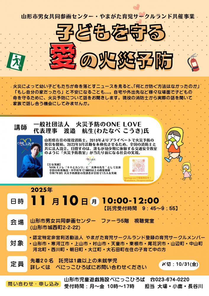 火災によって幼い子どもたちが命を落とすニュースを見ると、「何とか防ぐ方法はなかったのか」「もし自分の家だったら」と不安になることも・・・。自宅や外出先など様々な場面で子どもの命を守るために、火災予防について話をお聞きします。現役の消防士から実際の話を聞いて家族で話合う機会にしてみませんか。お問い合わせ・申し込みは山形市児童遊戯施設べにっこひろばTEL 023-674-0220