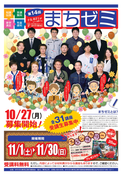 第14回 まちゼミ in さがえ 開催!寒河江市のまちを舞台に、お店のプロたちが先生になる「まちゼミ」が今年も開催されます!「まちゼミ」とは、お店の方が講師となり、専門店ならではの知識やプロのコツを無料で教えてくれる少人数制の講座です。 知りたかったあんなことから、やってみたかったこんなことまで、全31講座の多彩なラインナップであなたの「学びたい!」を応援します。お店の人の人柄やこだわりにも触れられる、またとない機会です。 ぜひ気軽に参加して、新しい知識とまちの魅力を発見してみませんか? イベント開催概要   開催期間 2025年  11月1日(土) 〜 11月30日(日)   開催場所 寒河江市内の各参加店舗   募集開始 2025年  10月27日(月)より   受講料 無料 ※一部の講座では材料費がかかる場合があります。詳細は各講座情報をご確認ください。   参加特典 3つの講座を受講してスタンプを集めると、抽選で20名様に1,000円分の商品券をプレゼント!  全31講座を一挙紹介!1巻き爪はつらいよ!  正しい爪切り講座  11/10(月), 11/17(月) 12:30~13:30  定員:各2名  200円(材料費)  寒河江巻き爪フットケアセンター  0237-85-12882時短トレーニング+スッキリ酸素BOX  11/1(土)〜11/29(土) 10:00~17:00  定員:各5名または1組  無料  フィットネスジム・ナンバーワン  080-5572-32473脂肪燃焼!機能改善!正しく楽しくできるトレーニング体験!!  11/4(火), 11/6(木), 11/18(火), 11/20(木)    ※11/4,18 14:30〜  ※11/6,20 19:30〜   定員:各4名  500円(体験料)  FITNESS GYM S.P.F.G. ROAD  0237-84-19194新しいヘルスケアの考え方 “こころ”と”からだ”のメンテナンスについて  11/15(土), 11/17(月), 11/30(日)     10:30~12:00  定員:各5名  無料  癒やしの総合サロン ゆあん  090-5846-75015VRによる世界旅行!  11/6(木), 11/20(木) 13:30~15:00  定員:各2名  無料  (株)MUGEN  050-1724-54966虹の会〜ペットと飼い主のための時間〜  11/7(金), 11/19(水) 13:30~14:30  定員:各3〜5名  無料  法泉寺×ペットのための想い出葬 One Me  0237-84-38567仏教美術の視点から見る 慈恩寺  11/26(水) 10:30~12:00  定員:10名  無料  (一社)寒河江市観光物産協会  0237-86-88668カラフルドリンク作り  11/2(日), 11/24(振休月) 11/30(日)     15:00~16:30  定員:各6名または3組  500円(ドリンク代)  Red Pearl  090-2955-69339誰でも作れる飾り巻き寿司  11/12(水),11/19(水) 14:00~15:00  定員:各10名  1,000円(材料費)  (有)栄寿司  070-6627-431110まぜるだけ!! おかずが増える納豆料理レシピ  11/12(水), 11/19(水), 11/26(水)    10:00~11:00  定員:各3名  700円(食材費)  サガエ納豆食品 雅納豆  0237-85-381711カラオケをしながらキム パプを食べましょう♪  11/29(土) 15:00~17:00  定員:5名  1,000円(材料費)  スナック メリー  080-1814-473912お茶席体験  11/16(日), 11/17(月) 13:30~14:30  定員:各5名  500円(茶菓子代)  きもの大長  0237-84-346113レザーコインケースを作ろう  11/9(日),11/23(祝・日) 13:00~14:30  定員:各3名  2,000円(材料費)  BOBIN  090-5181-779614タイルでスパイスラック  11/16(日) 9:30~11:30  定員:4名または4組  2,000円(材料費)  (株)K-TEC  090-4318-074715自分だけのオリジナルノート作り体験  11/29(土) 10:00~11:30  定員:5名  500円(材料費)  且瘡肢刷  0237-62-315316畳小物づくり体験  11/8(土) 10:30~11:30  定員:5名または3組  500円(材料費)  (有)鏡畳店  0237-86-506317慈恩寺の歴史と寒河江の産業に触れる ものづくり  11/26(水) 14:00~15:30  定員:10名  無料  (一社)寒河江市観光物産協会  0237-86-886618「納得!!」ジュエリーのリフォーム・修理・買取などのアドバイス  11/8(土), 11/15(土),11/22(土)     10:00~11:00  定員:各1名または1組  無料  小野指環店  0237-84-292719自分で張ってみよう 簡単網戸のひ・み・つ  11/8(土) 15:30~17:00  定員:3名  無料  窓の鈴建((有)鈴建)  0237-86-4468Sデジタル一眼レフカメラの使い方<初級編>  11/9(日), 11/10(月) 14:10~15:30  定員:各4名  無料  フォトショップ アキバ  0237-86-103121ぶらり撮影散歩  11/8(土),11/11(火) 13:30~15:30  定員:各5名  無料  フォトショップ アキバ  0237-86-103122自分で直す お家のフローリング リペア体験  11/8(土) 10:00~11:30  定員:2名または1組  500円(材料費)  (有)相原塗装店  0237-85-335523自分でできちゃうポタポタ水もれ解消法  11/23(祝・日) 9:00~10:00  定員:2名  無料  モリ住工(株)  0237-78-289624佐藤繊維ファクトリーツアー&GEA ランチ  11/13(木) 10:00~12:30  定員:12名  無料  (一社)寒河江市観光物産協会  0237-86-886625補助金利用で、お得にリフォーム お悩み解決!!  11/8(土), 11/9(日), 11/15(土), 11/16(日)     10:00~11:00/15:00~16:00  定員:各1組  無料  (株)創建  0237-84-238826空き家を資産に変える実践講座  11/4(火) 13:00~13:30  定員:3名  無料  鰹Zまいるーむ情報館  0237-86-639627似合う色と好きな色は違うかも…  11/7(金), 11/8(土) 10:00~11:30  定員:各3名  無料  ブティック絵里香  090-5185-298028創業前の基礎知識  11/4(月)~11/28(金)  平日のみ 9:00~17:00  定員:各1名  無料  寒河江市商工会  0237-86-121129知っておきたい これからの時代のお金の貯め方  11/15(土) 11:00~/13:00~  定員:4名  無料  ソニー生命保険 