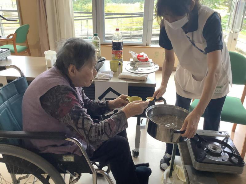 10月8日、秋の風物詩芋煮会を行いました。利用者様に野菜や調味料を入れてもらい調理を楽しんでもらいました。完成した芋煮を昼食時に食べて頂きおかわりする方や美味しいという声も多く秋の味覚を楽しんでもらいました。