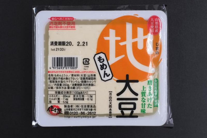 地大豆(じまめ)は、私たちのふるさと山形にとことんこだわって作ったお豆腐です。山形県産大豆を100%使用したこだわりのもめん豆腐です。他の国産大豆でつくった豆腐と比べても、味わいの深さとコクがひと味違います。1)山形の豆にこだわる ふるさと山形の農家さんが心をこめて生産した大豆にこだわり、 地域限定の山形県産大豆(タチユタカ)を100%使用しました。2)山形の水にこだわる 山形の霊峰月山の雪解け水は、ブナの原生林を下り、 寒河江川の地下層を伝わって、純度が高く、 ほのかな甘味を感じる天然水として工場に組み上げられます。3)山形の業にこだわる 製造量も限定されますが、 地元に伝わる昔ながらの自然製法で じっくり手をかけて造り上げた良質な木綿豆腐です。〈商品名〉 地大豆(じまめ)もめん〈名称〉 もめんとうふ〈原材料〉 大豆(山形県産・遺伝子組み換えでない) 豆腐用凝固剤(粗製海水塩化マグネシウム・硫酸カルシウム)〈内容量〉 350g〈保存方法〉 要冷蔵(3℃〜10℃)→ 「地大豆(じまめ)もめん」ツインパック